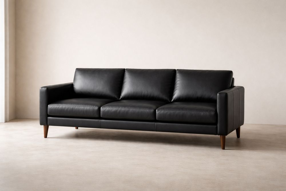 Black Leather Sofa with Solid Wood Legs