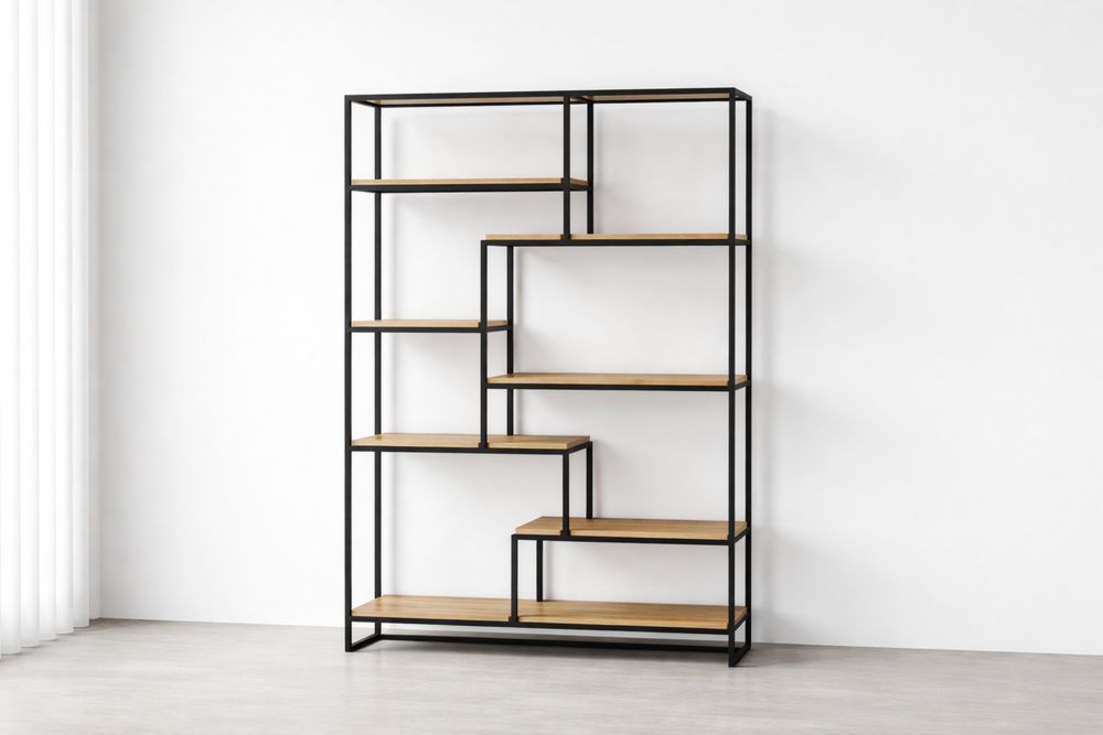 Black Metal Frame Bookshelf with Oak Veneer Shelves