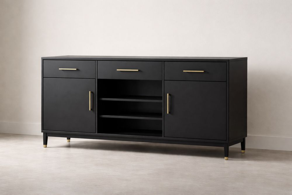 Black Wood Sideboard with Brass Accents and Storage Compartments
