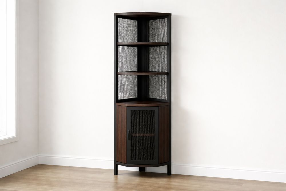 Corner Shelf Cabinet Wood and Black Metal Mesh