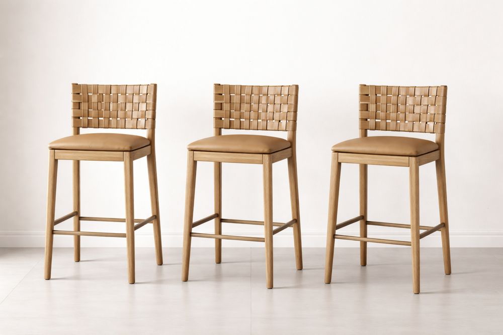 Leather Bar Stool Set with Woven Backrest, Set of 3