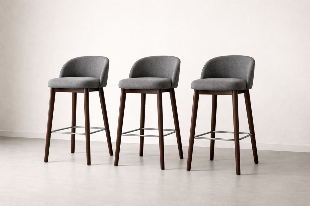 Set of 3 Bar Stools with Wooden Legs and Gray Cushions