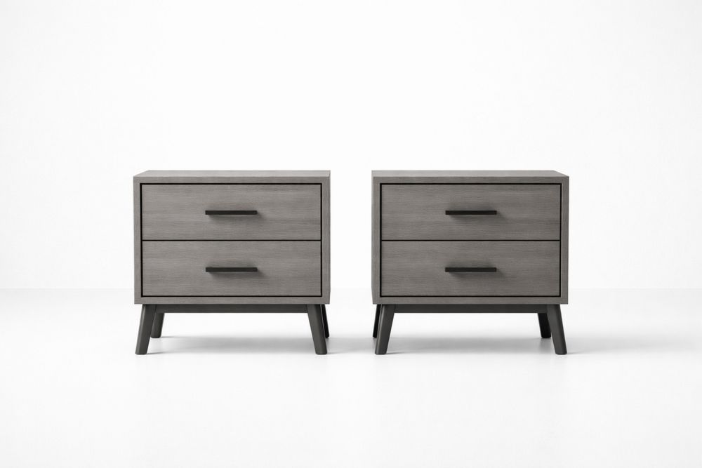 Set of Two Gray Wood Nightstands with Two Drawers and Metal Legs