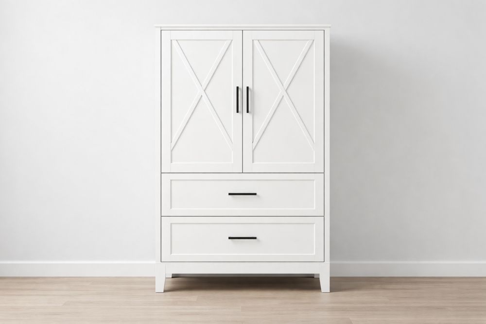 White MDF and Solid Wood Storage Cabinet with Drawers and Doors