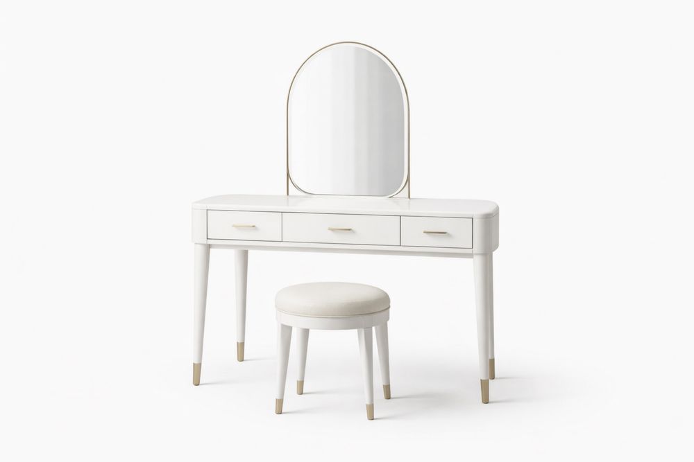Dimensions: Vanity: Length 120 cm, Width 40 cm, Height 75 cm. Mirror: Height 60 cm, Width 50 cm. Stool: Diameter 35 cm, Height 45 cm.