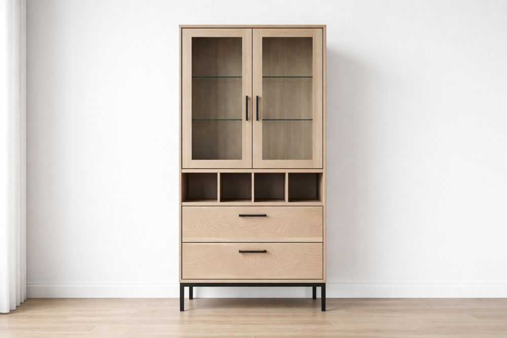 Wood Display Cabinet with Glass Doors and Drawers Natural